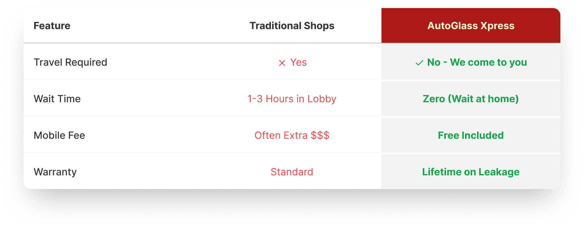 We use OEM-equivalent glass and high-grade urethane adhesives. The quality of the seal is identical to an in-shop replacement. Guaranteed.